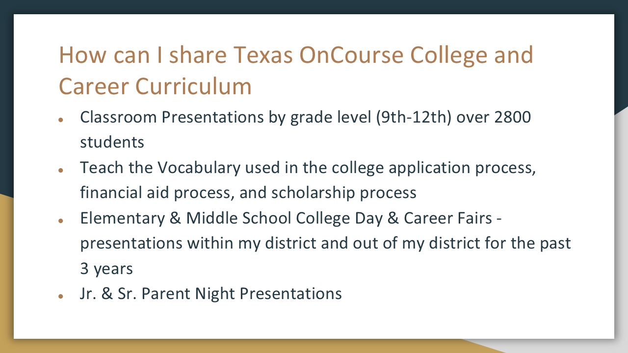 Yvonne Martinez, College Career and Military Readiness Advisor of Tom C. Clark High School in San Antonio, Texas, joined us for our session and shared beneficial resources such as RaiseMe for scholarships and Volunteer Match for community service hours. She also presented ways to share the Texas OnCourse College and Career Readiness Curriculum with your students and families.